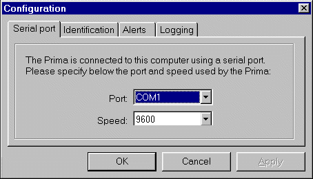 When you run IntelliPRIMA for the first time, the program will search for your CDQ Prima on the first serial port on your machine (for our USB cables you'll need to check which Virtual COM port has been assigned to the cable). If the Prima is not found, or you use COM1 for another device - e.g. a modem, a message box appears. Click OK and the Properties screen will appear - you should then select the correct COM port. The default speed setting of 9600 is correct in most instances.